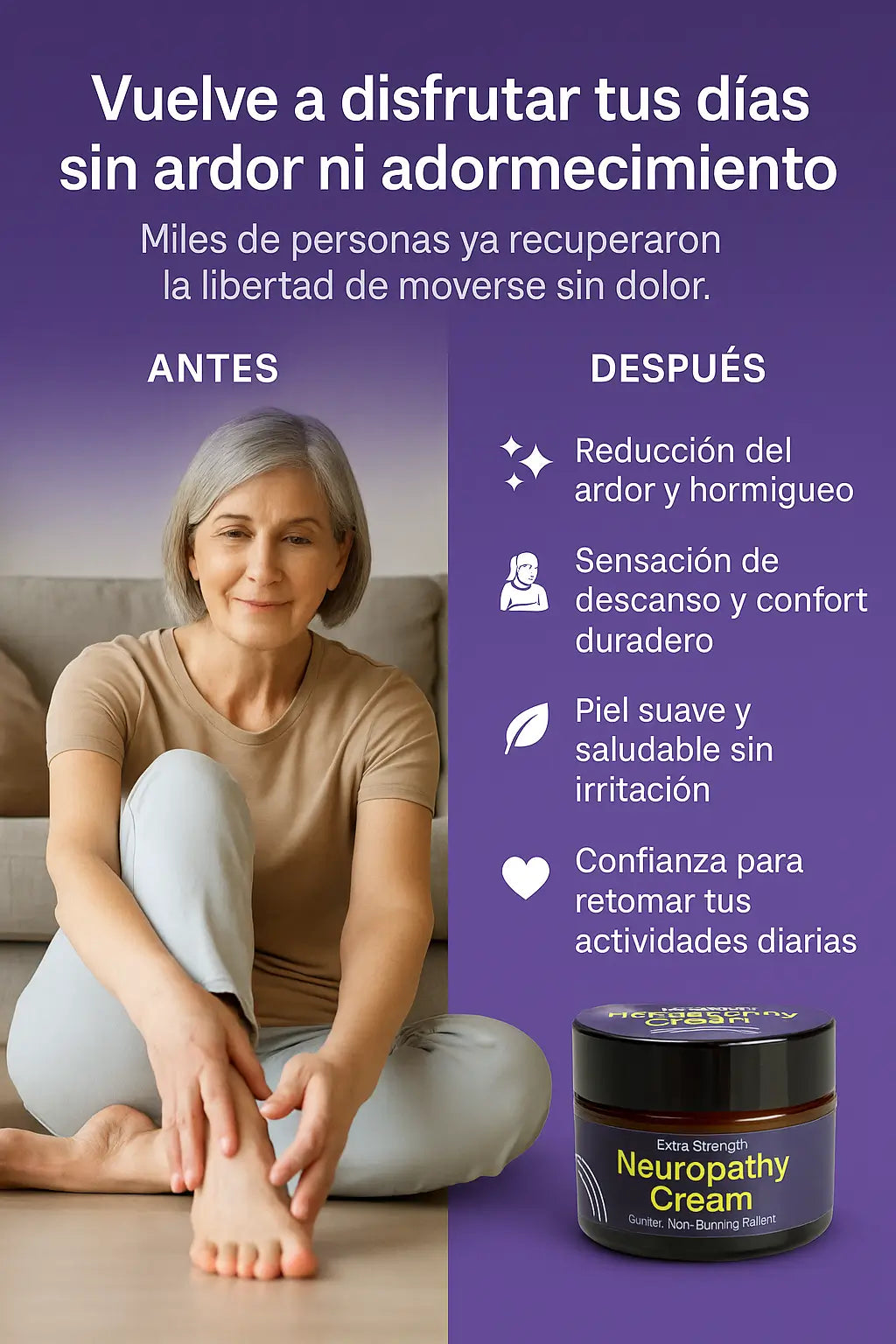 Lo empecé a usar en los pies y el ardor bajó desde la primera semana. No quema y huele suave. Recomendado.